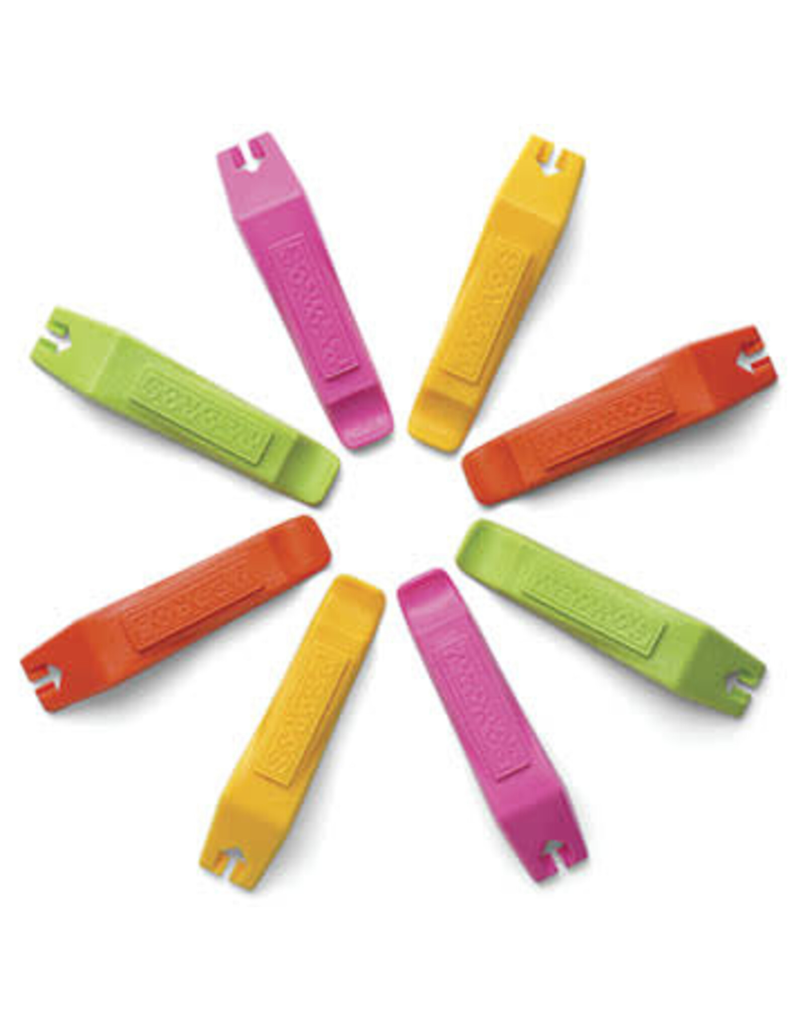Pedro's tire levers feature molded box construction and a proprietary plastic composite blend that makes them very strong. The unique chisel tip shape easily inserts beneath the tire bead and the slightly thicker shape keeps the lever securely in place. Additionally, the bold shape of the lever and helpful dual spoke hooks makes removal of even the tightest tires a simple task. If you ever, somehow, manage to use your gorilla strength to break them, these levers are backed by Pedro's lifetime warranty.